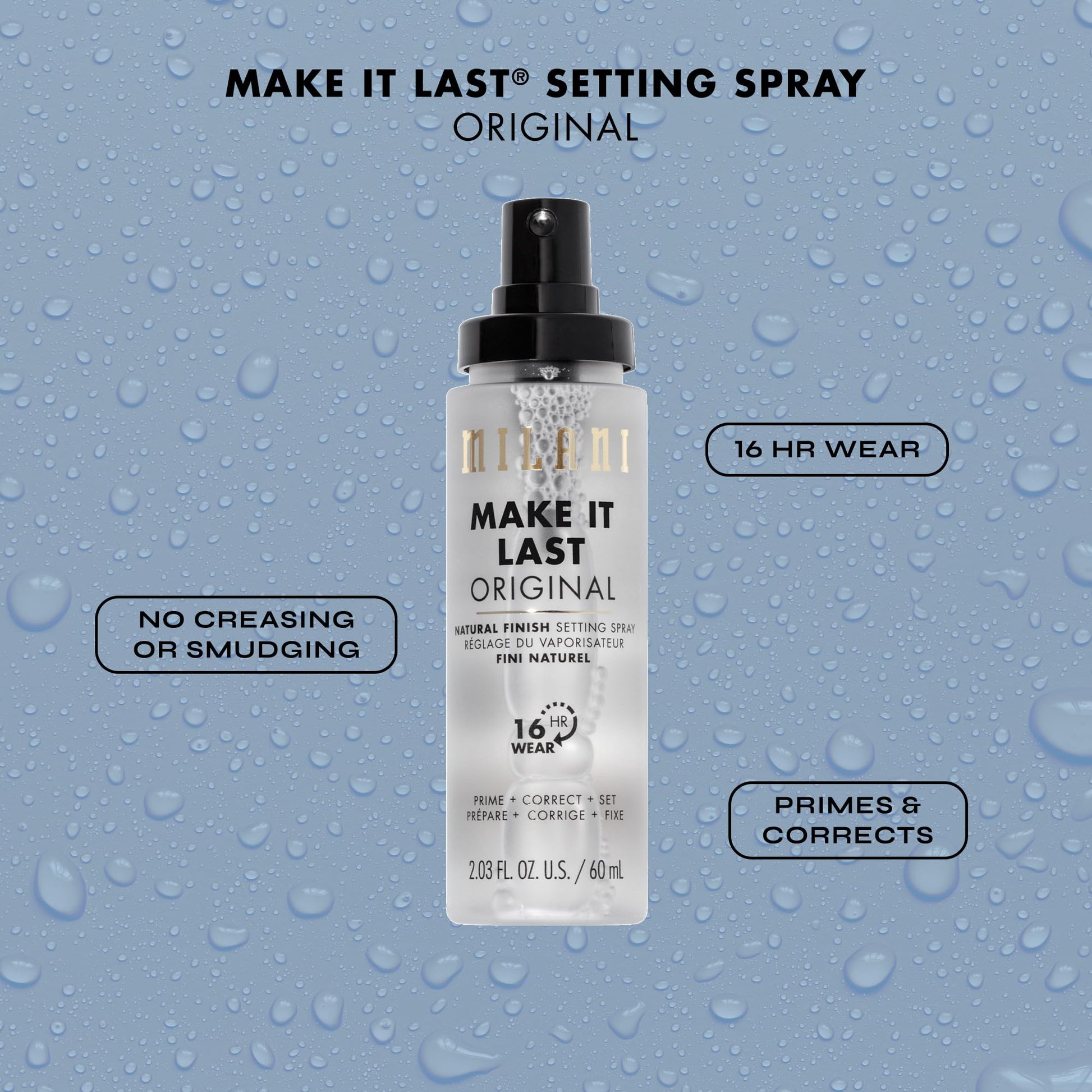 - PRIME + CORRECT + SET: Make It Last Prime + Correct + Set Setting Spray preps your face, reduces the appearance of imperfections and then locks in for the long haul. You can enjoy up to 16 hours without a crease or smudge in sight. Spray before or after makeup application, or wear it alone for a captivating natural finish.