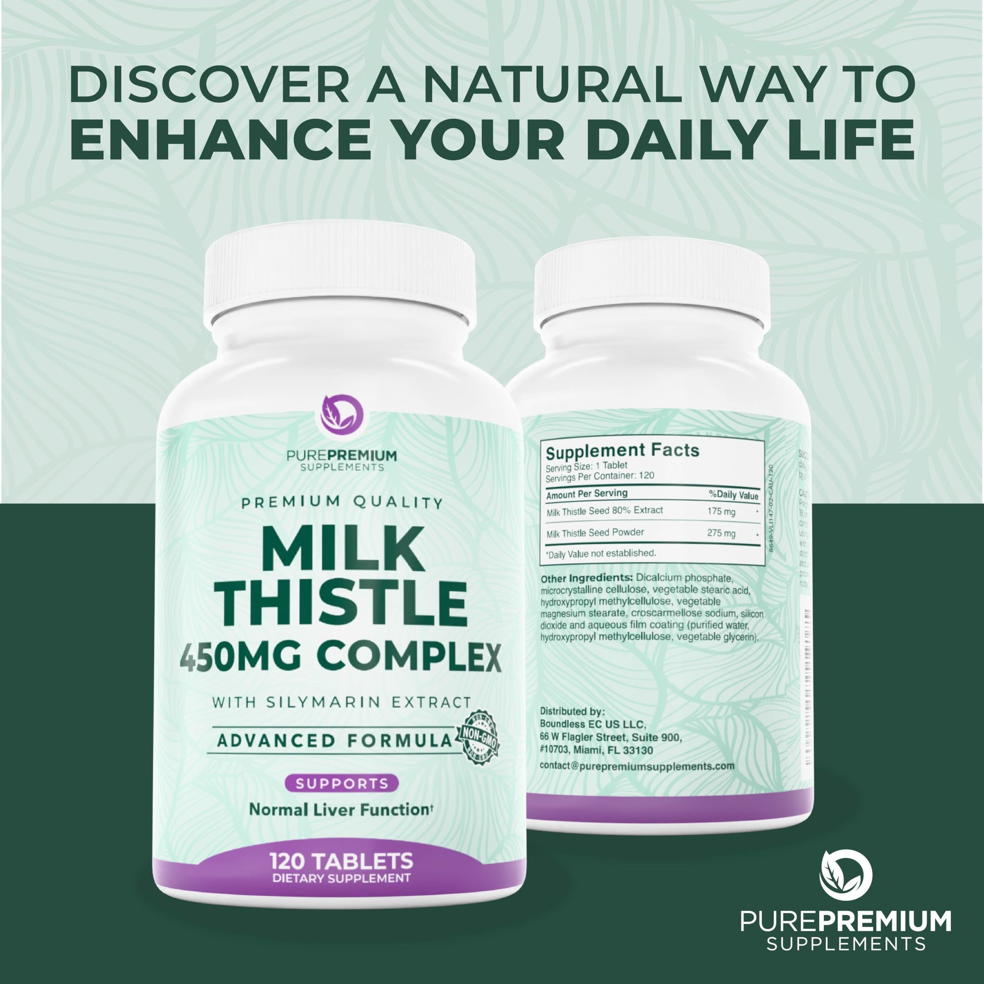 PurePremium Milk Thistle Supplement, 120 Tablets, 80% Silymarin Standardized Extract - High Potency Pure 450mg Complex – Supports Normal Liver Function & Overall Health – Non-GMO, Gluten-Free